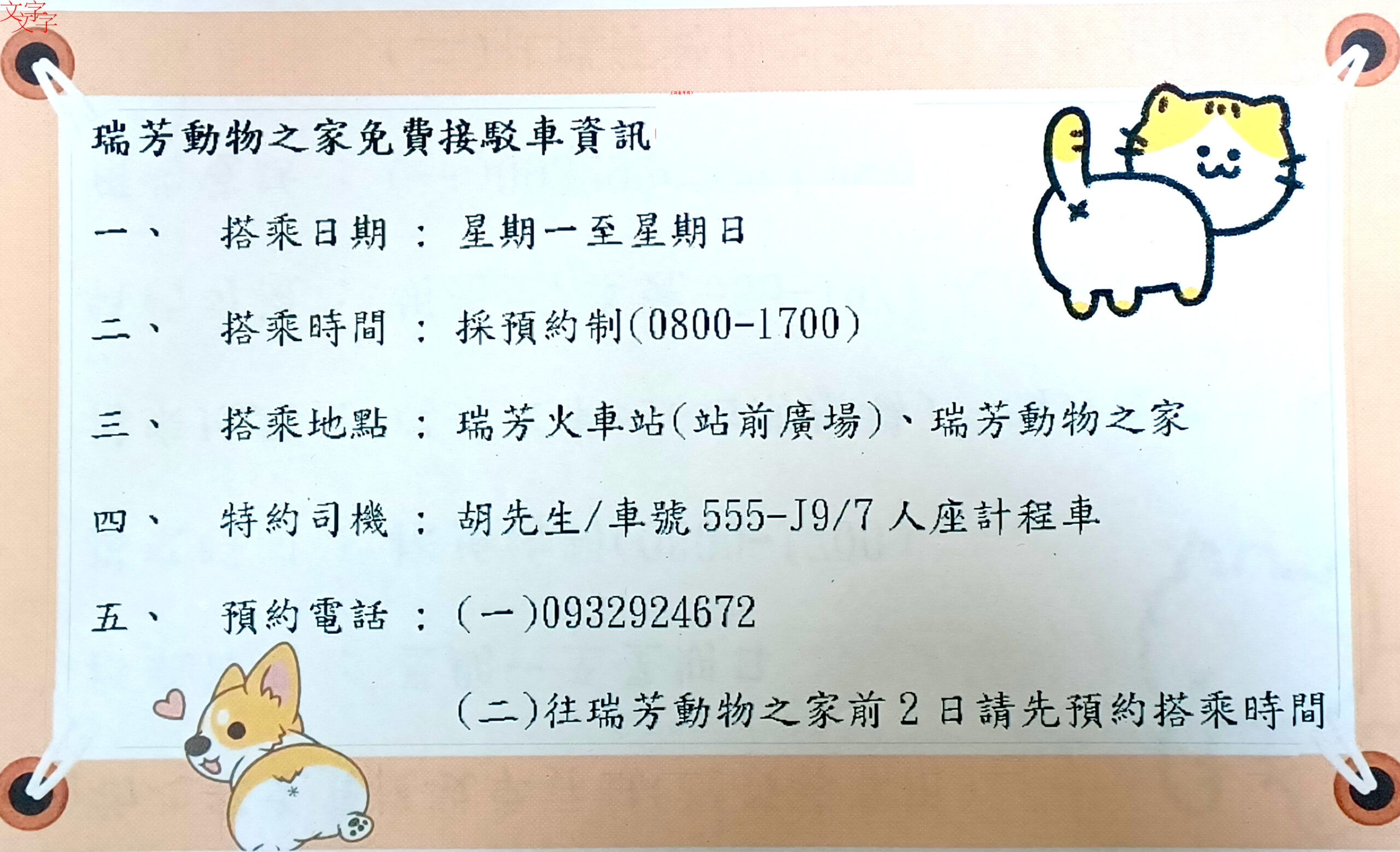 新北市政府動物保護防疫處瑞芳動物之家位於瑞芳區八分寮中坑路3號,園區隱身於翠綠山林間,被譽為「山中教堂」,環境清幽且設計獨特,是全台少數兼具收容、教育與休閒功能的動物之家。為提升民眾到訪與認養便利性,動保處即日起推出免費接駁計程車服務。民眾只要提前兩天預約,即可從瑞芳火車站搭乘專車直達園區,不必再煩惱交通問題,輕鬆上山與犬貓互動,尋找心儀的毛寶貝。接駁車每週7天皆可預約,服務時間為上午8點至下午5點,預約專線:0932-924-632。